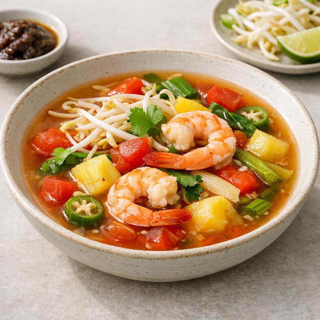 Deze Canh Chua Tom is een frisse Vietnamese zoetzure soep met garnalen die van nature glutenvrij en lactosevrij is. De balans van ananas, tamarinde en verse groenten maakt het gerecht licht en makkelijk te bereiden. Gebruik vissaus zonder gluten als smaakmaker.