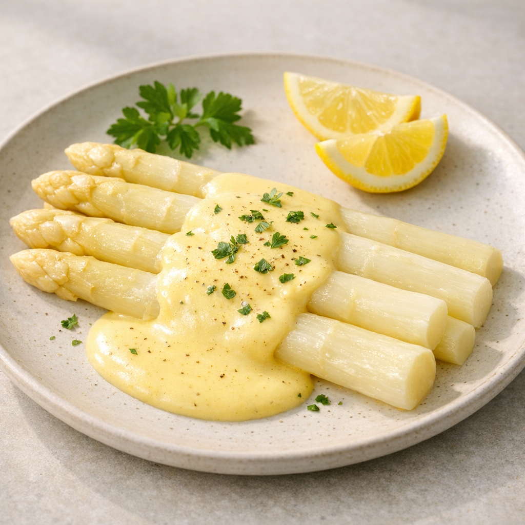 Dit recept voor witte asperges met hollandaisesaus is eenvoudig en volledig glutenvrij. De saus is klassiek van smaak, maar kan ook worden gemaakt met een lactosevrije botervervanger, wat het recept goed geschikt maakt voor een lactosearm dieet. Een fijne en rustige keuze voor wie van een lichte voorjaarsmaaltijd houdt.