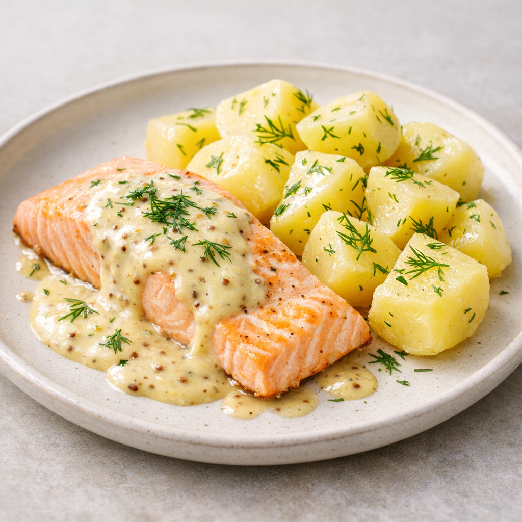Een eenvoudig en voedzaam gerecht met zachte zalm en een milde mosterdsaus op basis van lactosevrije room. De gekookte aardappelen vormen een rustgevende basis en zijn gemakkelijk te bereiden. De verse dille maakt het gerecht helemaal af. Ideaal voor een zorgeloos en lekker diner.