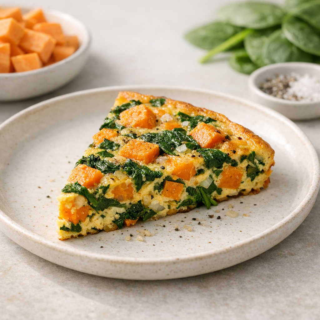 Deze frittata heeft zachte zoete aardappel, spinazie en een licht krokante korst. Je proeft een hartige combinatie waar je goed mee kunt ontbijten.