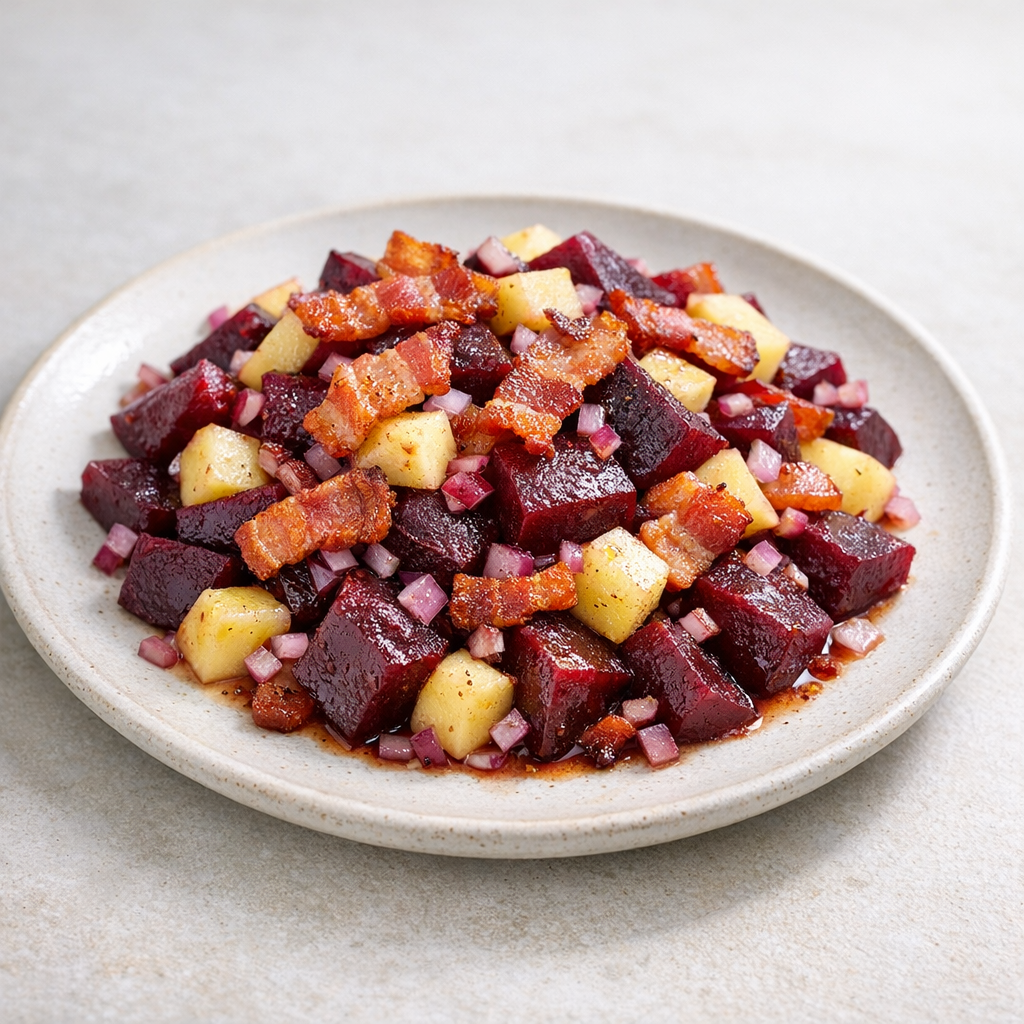 Frisse rode bietjes combineren met zoete appel en krokant spek tot een smaakvol bijgerecht.