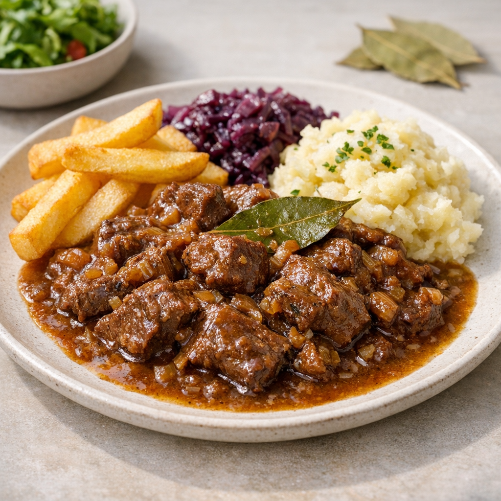 Deze Limburgse klassieker is een stoofgerecht van malse runderriblappen in een zoetzure saus met ui, knoflook en appelstroop. Het langzaam garen zorgt voor een volle smaak. Lekker om van tevoren te bereiden en rustig op te warmen.